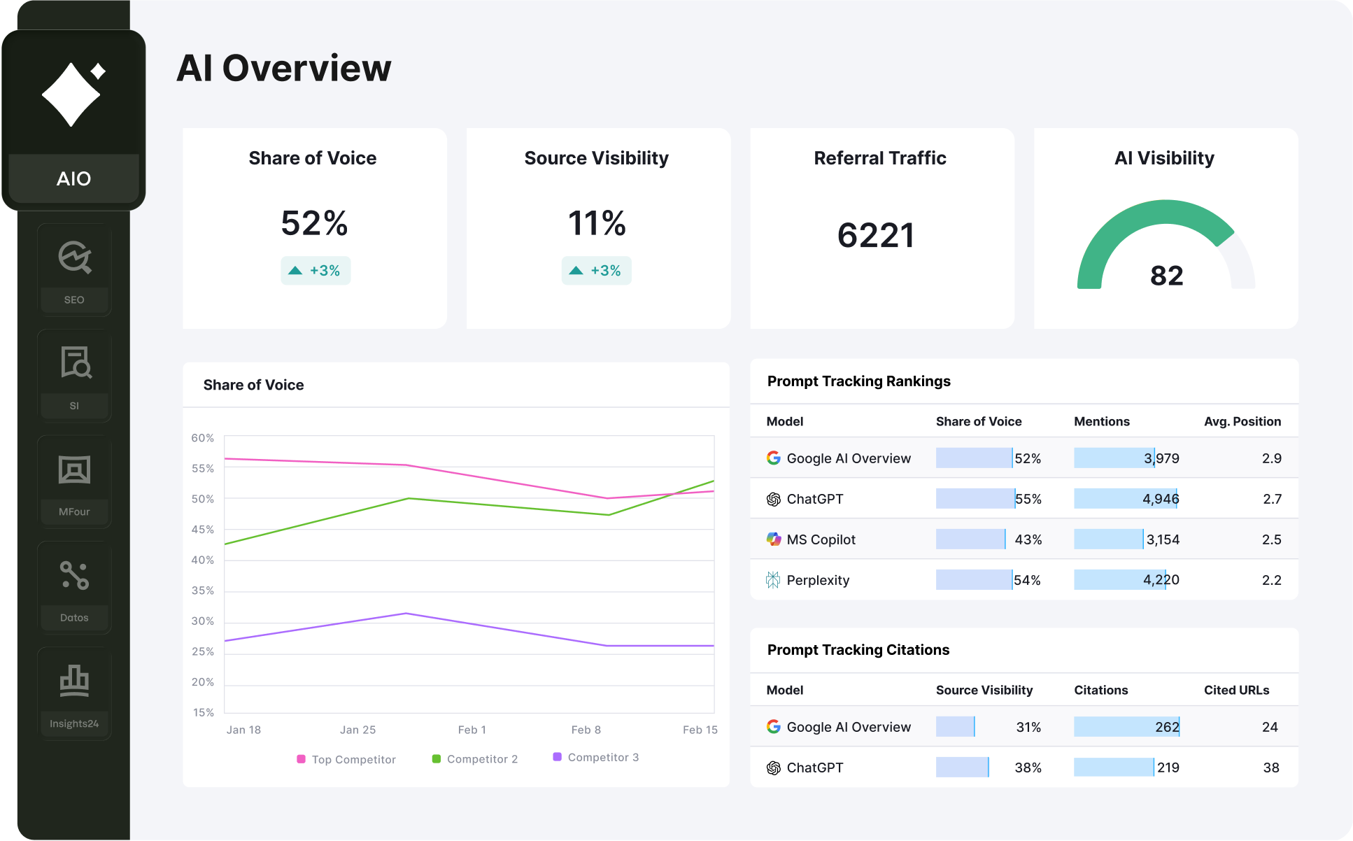 Share of Voice is a Semrush metric that takes into account how often a brand is mentioned and in what position. For example, if a brand was mentioned first in every AI answer, they would achieve an SoV of 100%